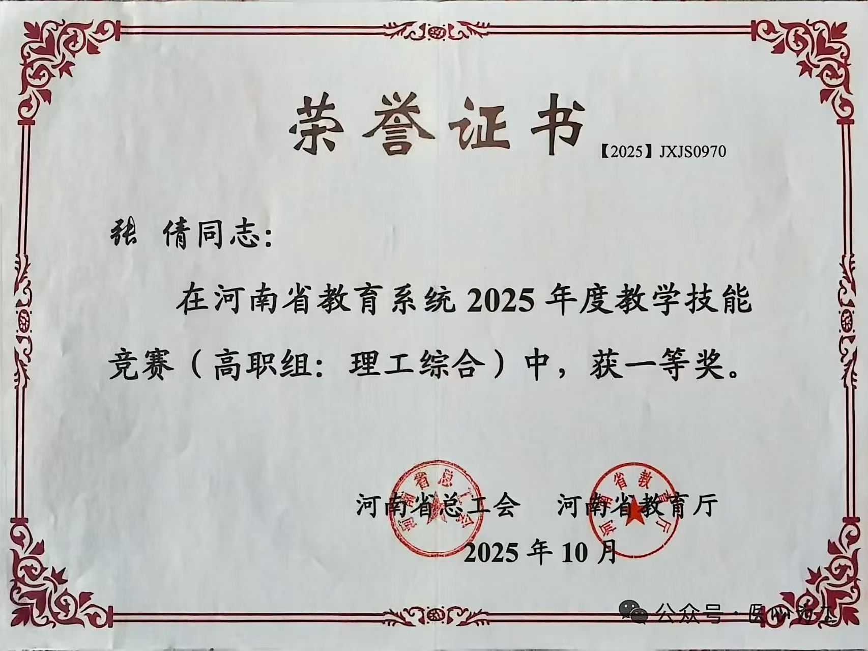 近日,由河南省总工会、河南省教育厅联合主办,河南省教科文卫体工会与洛阳理工学院共同承办的2025年度教学技能竞赛圆满落幕。在此次比赛中,我系张倩老师凭借出色的表现,荣获理工综合类一等奖。