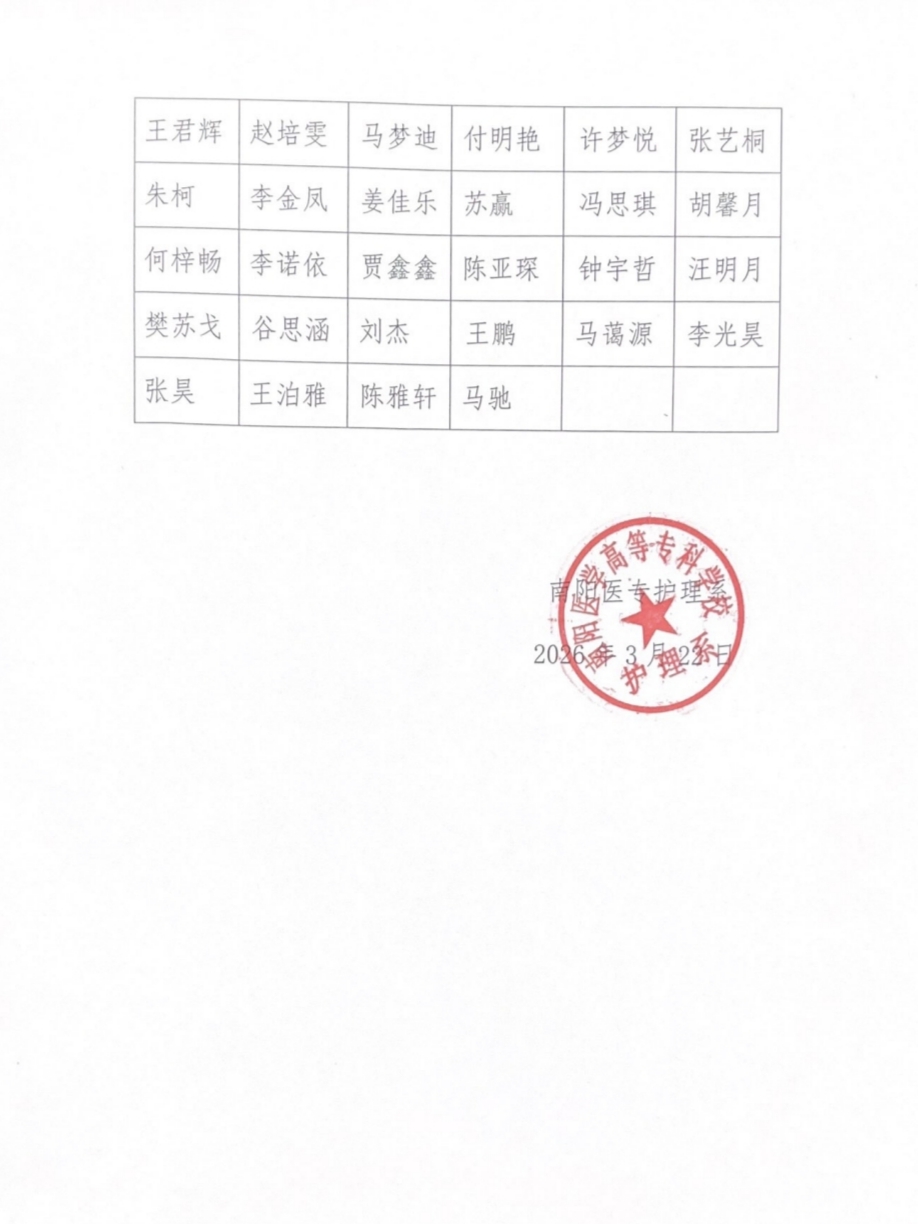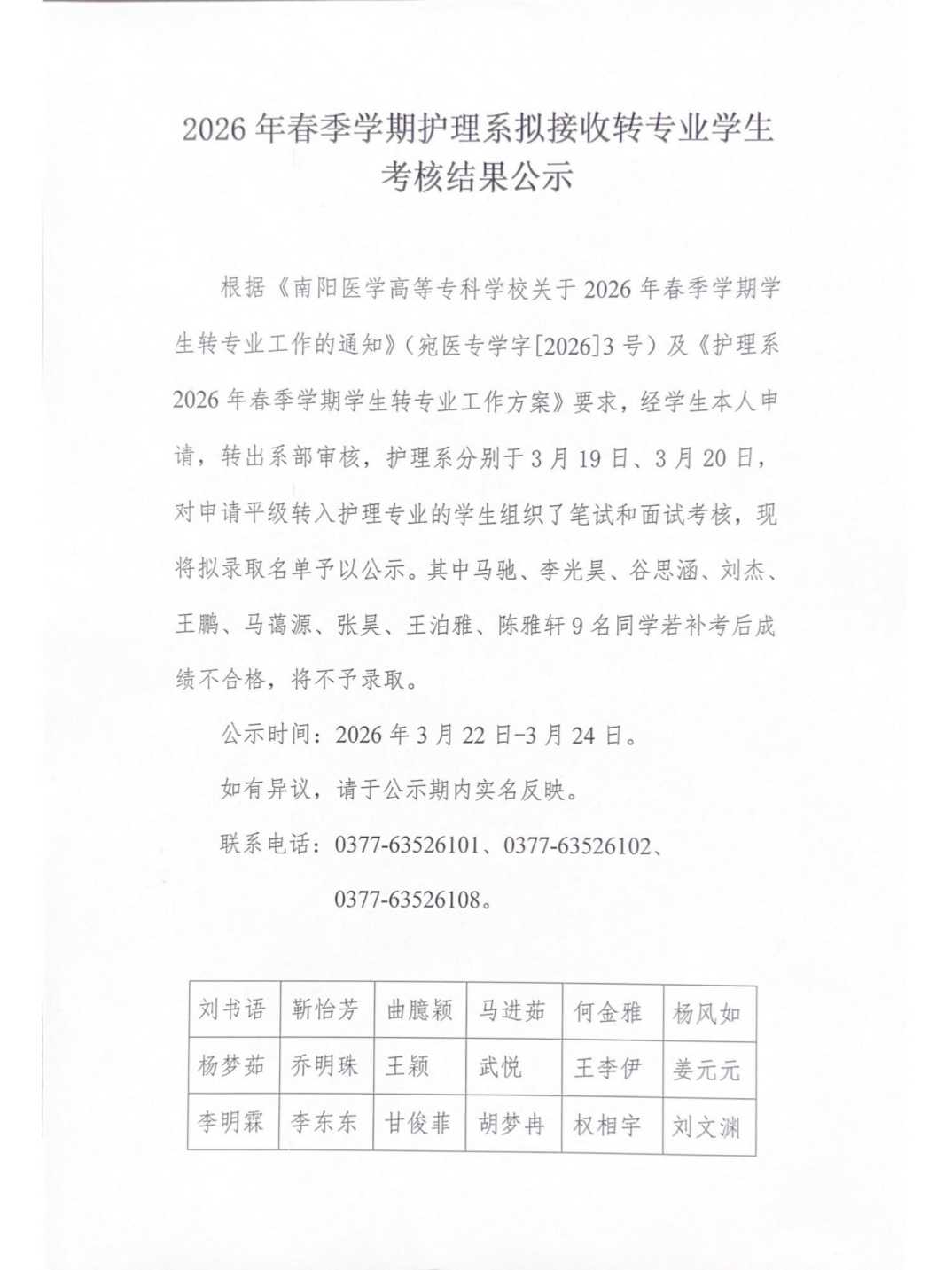 根据《南阳医学高等专科学校关于2026年春季学期学生转专业工作的通知》(宛医专学字[2026]3号)及《护理系2026年春季学期学生转专业工作方案》要求,经学生本人申请,转出系部审核,护理系分别于3月19日、3月20日,对申请平级转入护理专业的学生组织了笔试和面试考核,现将拟录取名单予以公示。其中马驰、李光昊、谷思涵、刘杰、王鹏、马蔼源、张昊、王泊雅、陈雅轩9名同学若补考后成绩不合格,将不予录取。