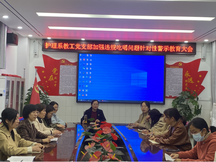 为严肃作风纪律,针对性加强广大党员干部的警示教育,巩固学习教育成效,结合校纪委《关于加强违规吃喝问题针对性警示教育的通知》要求,护理系党总支于9月30日上午召开了加强违规吃喝问题针对性警示教育会,会议由护理系党总支书记闫珂主持。