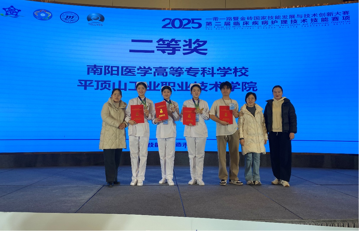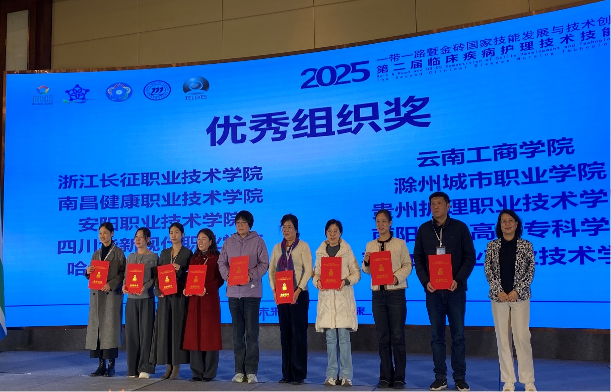 2025年11月20日至23日,2025 “一带一路”暨金砖国家技能发展与技术创新大赛--第二届临床疾病护理技术技能赛项在漯河医学高等专科学校举行,我校护理系代表队凭借扎实的专业素养和出色的团队协作,从全国50支参赛队伍中脱颖而出,学生马雪怡、王艺梦、王颖、方明程荣获二等奖,吕文艳、张延军荣获“优秀指导教师奖”,我校荣获“优秀组织奖”。