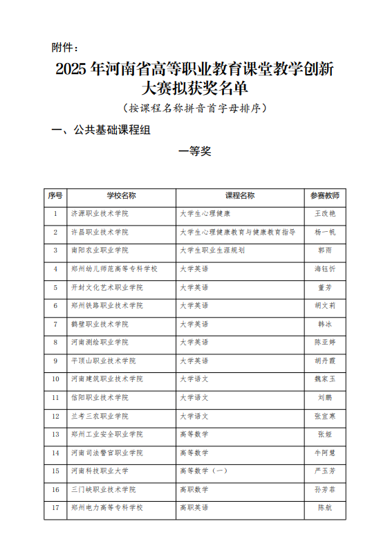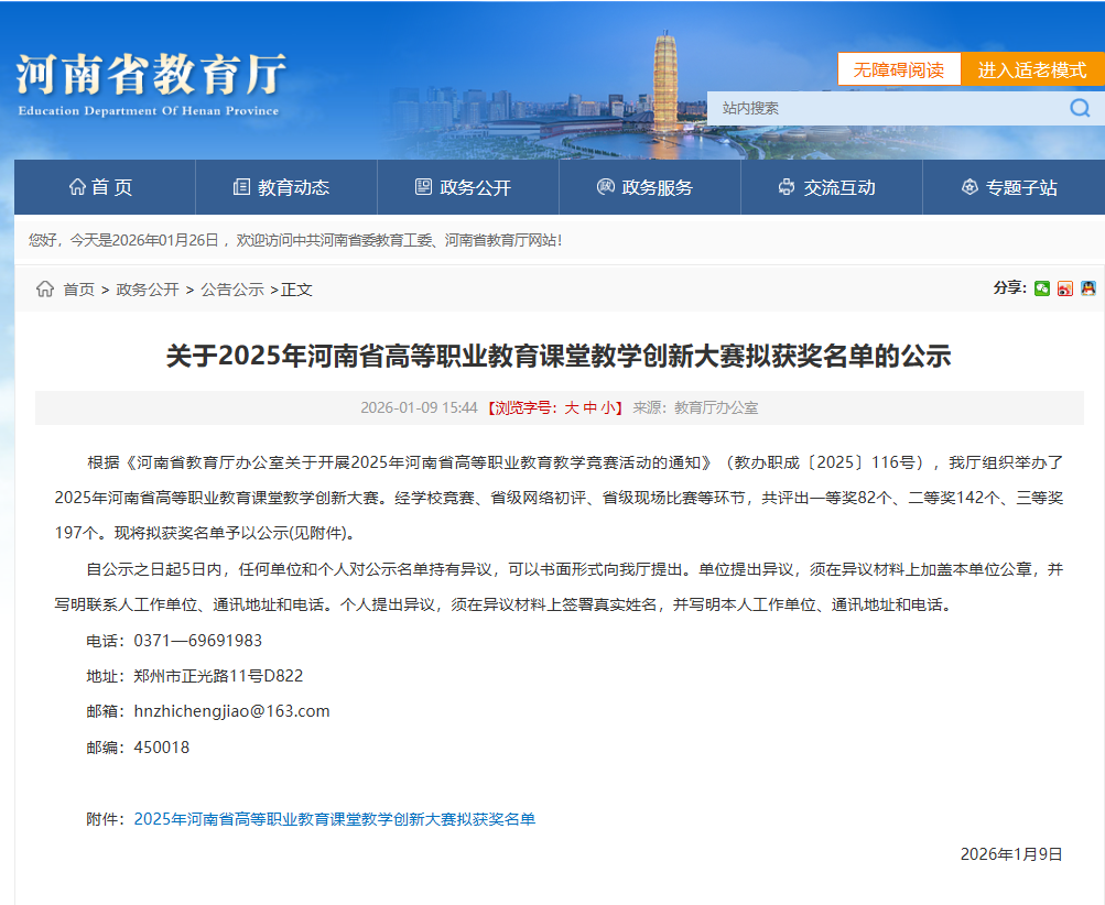 2026年1月20日,河南省教育厅办公室公布2025年河南省高等职业教育课堂教学创新大赛获奖名单,我系刘倩老师斩获理工农医类课程组二等奖。本次大赛由省教育厅主办,含说课程、无学生教学展示、现场答辩3个环节,全面考核教师综合能力。刘倩老师凭借清晰的设计思路、生动的教学展示和流畅答辩获评委认可,彰显了我系教师过硬的专业素养与教学创新能力。