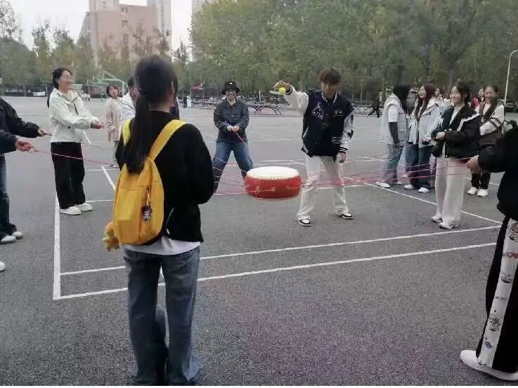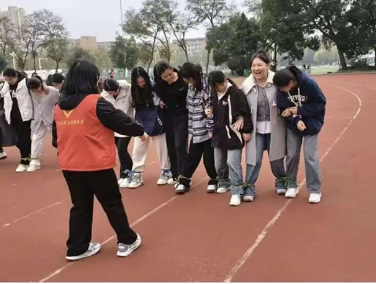 本次素质拓展活动设计了“同心鼓”、“三人两足”等富有挑战性与趣味性的团队项目。在轻松愉快的氛围中,同学们放下学业压力,全身投入,默契配合,用行动诠释团结的力量,用笑声传递友谊的温暖。在“同心鼓”项目中,同学们围成一圈,紧握绳索,共同控制鼓面颠球。从最初的生疏到后来的娴熟,不仅锻炼了协调能力,更增强了彼此的信任与责任感;在“三人两足”项目中,各班同学肩并肩、步调一致,喊着响亮的口号,奋力冲向终点。跌倒了,互相搀扶;落后了,彼此鼓励。赛场上此起彼伏的加油声、欢笑声,汇成一曲青春的交响乐,回荡在校园的上空。